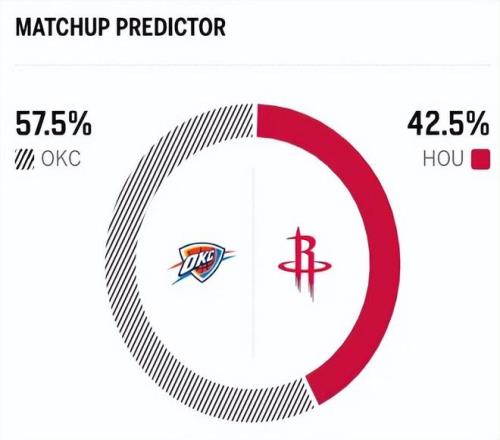赛前,美媒ESPN对本场比赛进行了胜率预测,火箭队胜率依旧只有42.5%,劣势明显,雷霆胜率则为57.5%,还是被看好能够双杀火箭。